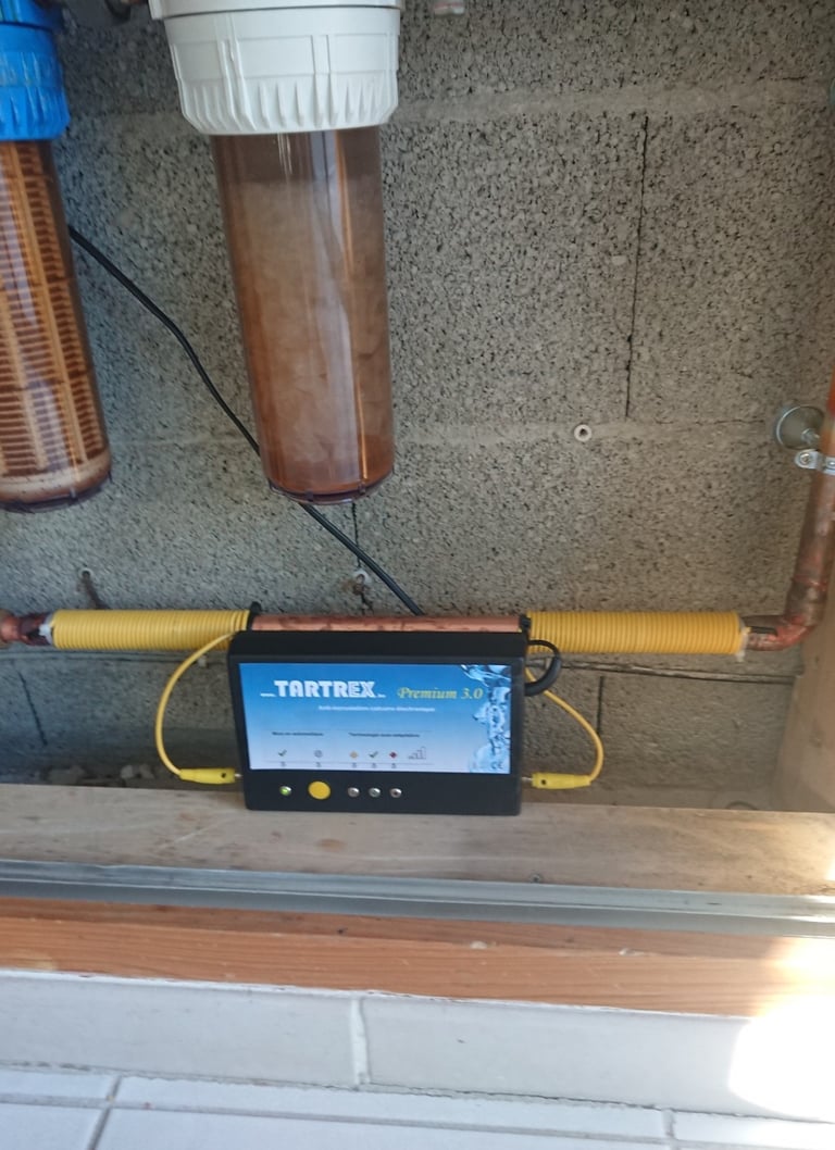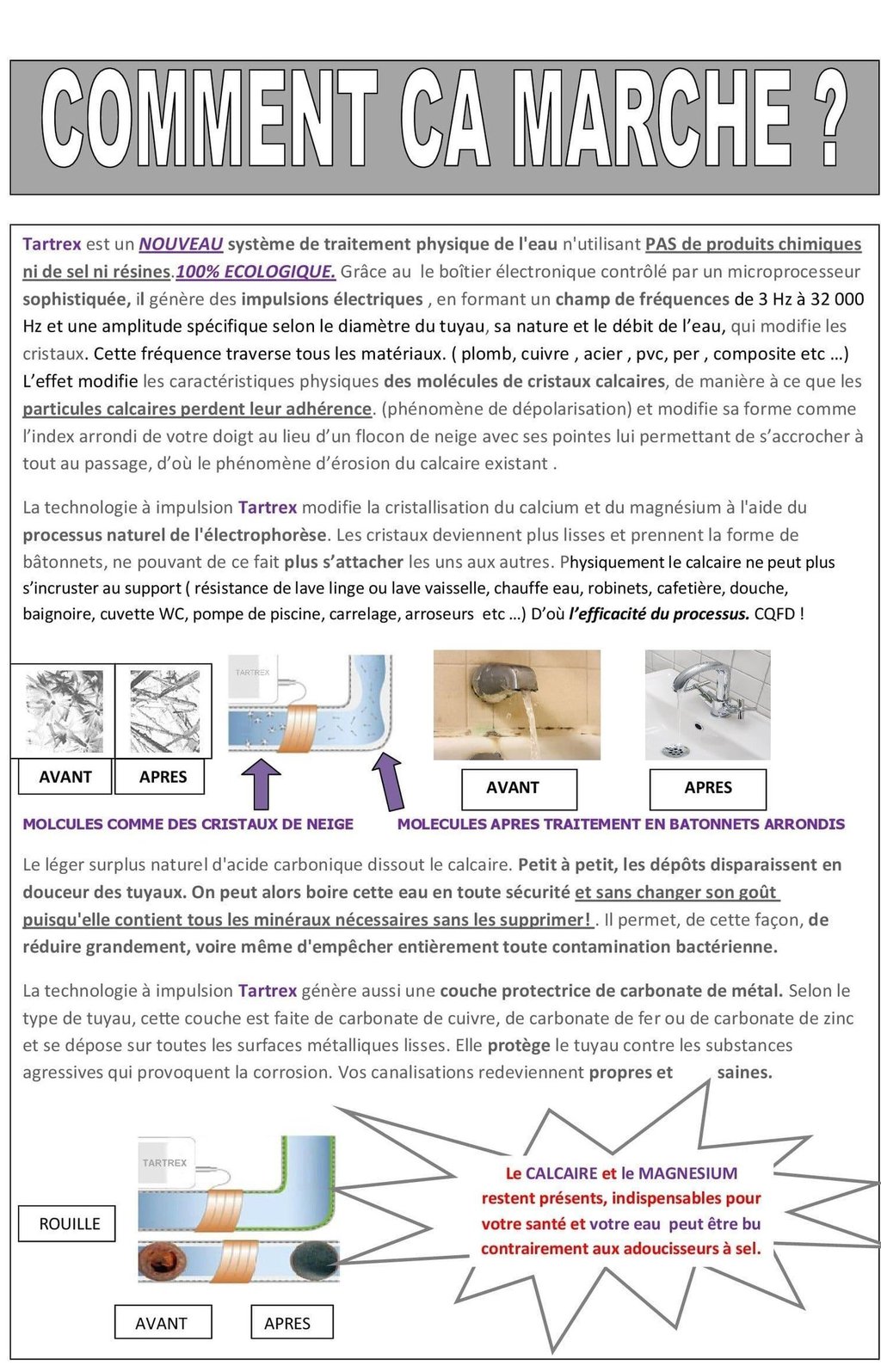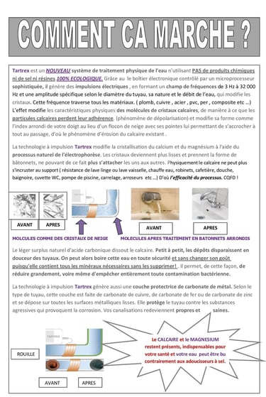 Issu et abouti après 7 ans de recherches et essais de notre section RD , Tartrex , adoucisseur breveté en 1985, génère des ondes électriques à haute fréquence sur une amplitude spécifique qui ne vise que la molécule de calcaire sans déranger les qq 100 autres molécules contenues dans l'eau. 2 effets: 1) il va dépolariser la molécule qui fait qu'elle ne peut plus s'accrocher à rien. 2) il va modifier sa forme . au lieu d'être un flocon de neige avec ses pointes qui lui permettent de s'accrocher à tout ,ca se transforme en petits bâtonnets arrondis comme votre index qui en circulant librement dans l'eau vont frotter tout sur leur passage, qui dit frottement dit érosion qui dit érosion dit DETARTRAGE INTEGRAL UNIQUE SUR LE MARCHE !! CFQD §